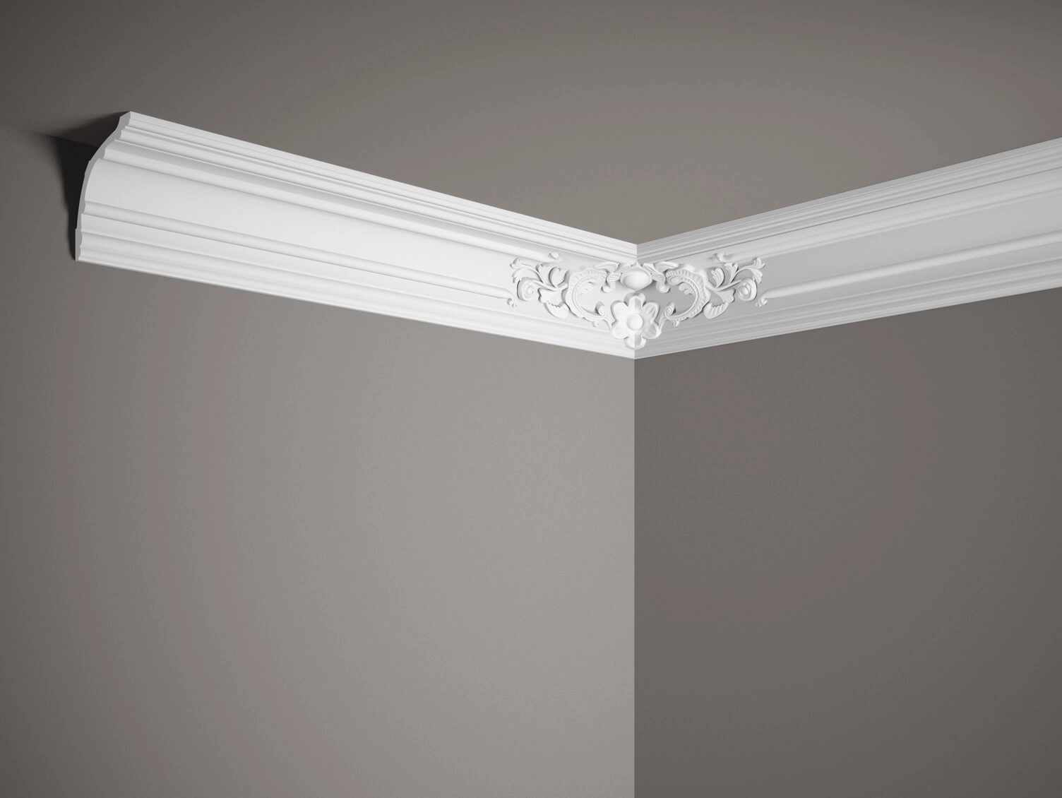 Cornișa MDA113 are un design unic, decorat cu un motiv floral subtil. Datorită utilizării poliuretanului ProFoam®, modelul este foarte detaliat, iar greutatea produsului, în ciuda dimensiunilor sale crescute, este mică. Profilul conectează eficient planul peretelui cu tavanul, creând o tranziție lină și elegantă. Dimensiunile generoase permit camuflarea capetelor tăiate neuniform ale tapetului. Designul său special permite mascarea și organizarea cablurilor și firelor libere. Cornișa poate fi instalată în vestibule, bucătării sau alte interioare cu un nivel ridicat de umiditate. Se caracterizează prin rezistență la apă și la lumina puternică a soarelui. În timp, nu se deformează și nu își schimbă culoarea, ceea ce o face un accesoriu interior excelent atât pentru spațiile domestice, cât și pentru cele publice.