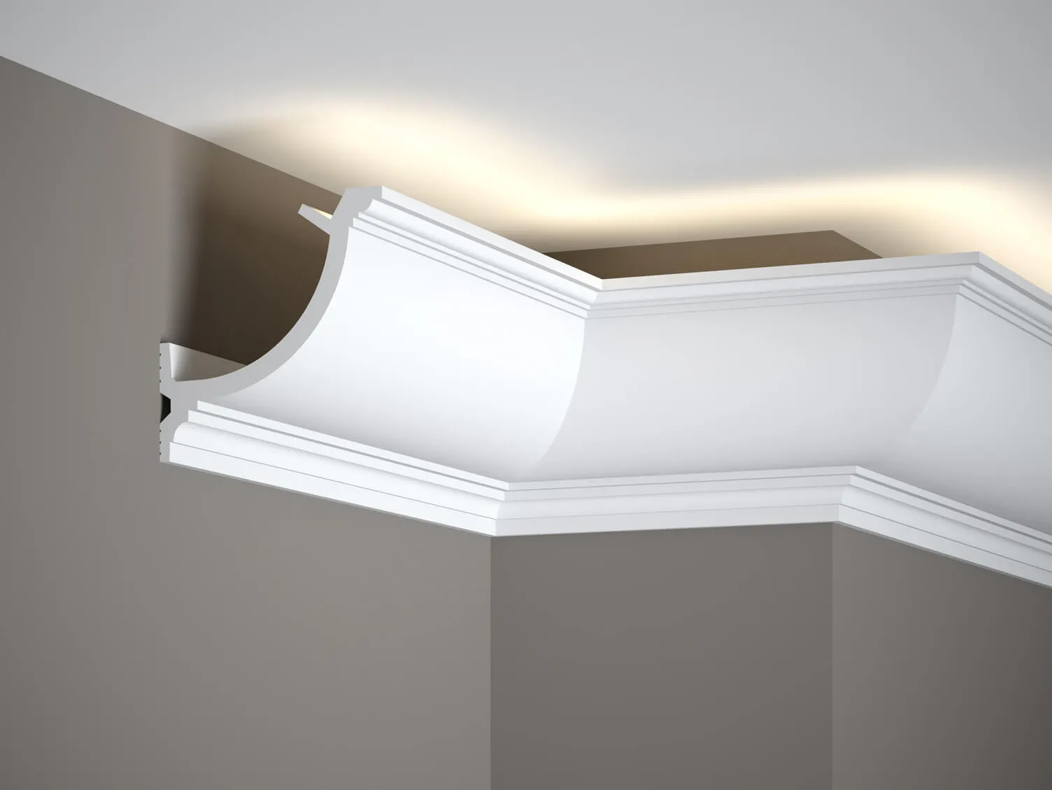 Cornișa QL027 este un model cu formă rotunjită, finisat cu canelură decorativă. Materialul PolyForce®, avansat tehnologic, garantează rezistență la umiditate și radiațiile UV. Dispune de tehnologia ScratchShield®, care întărește materialul.